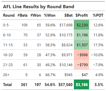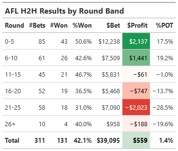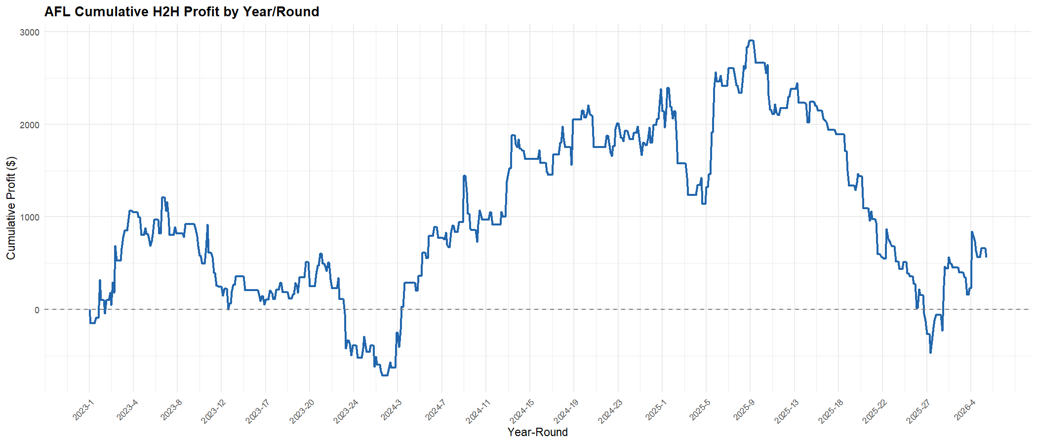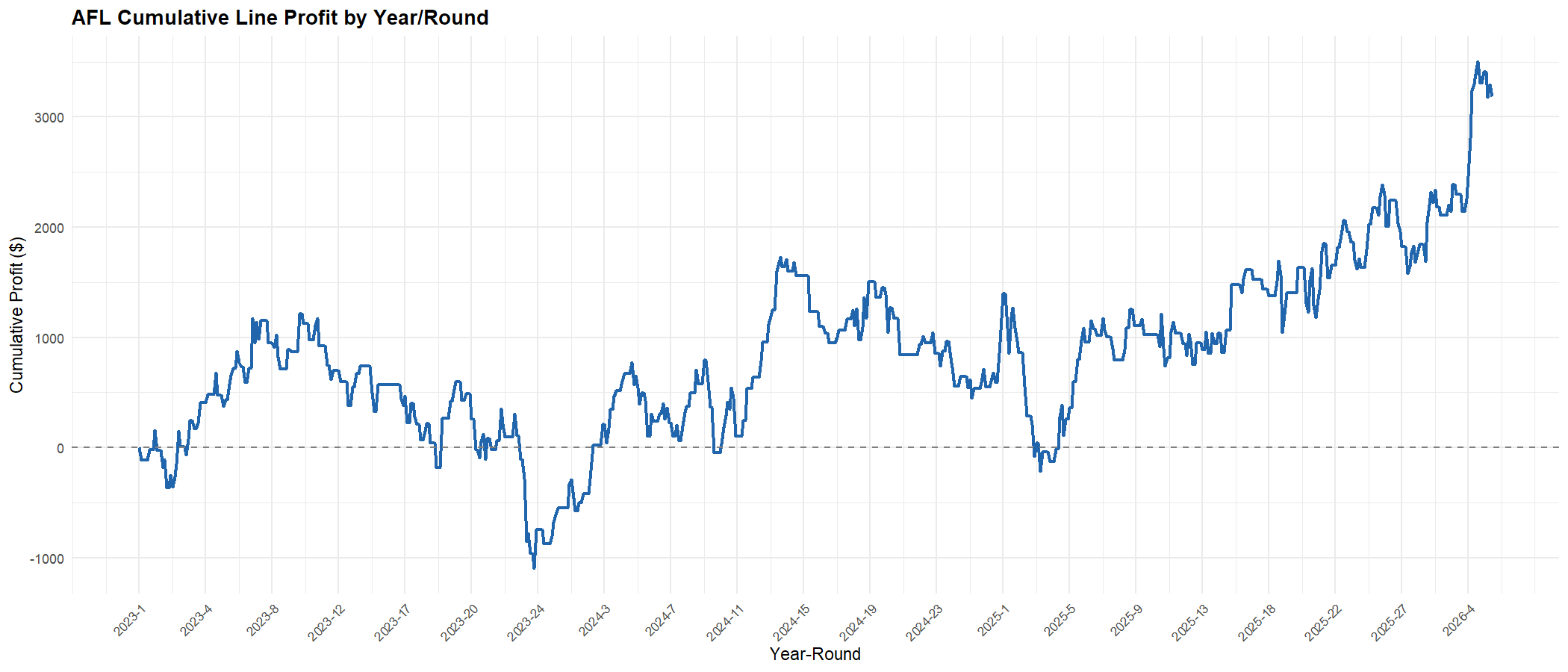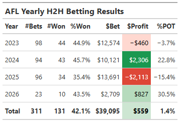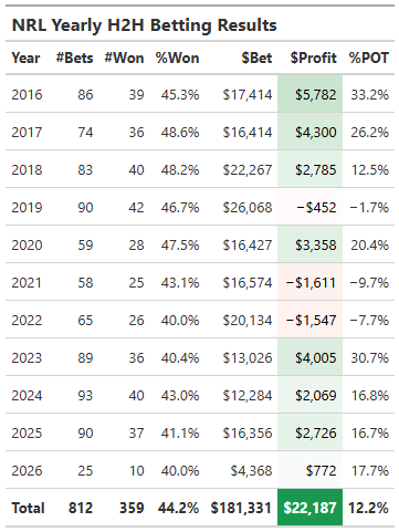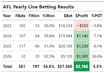 Historical betting performance across AFL and NRL — line bets, head-to-head, and player prop results tracked transparently since 2006.