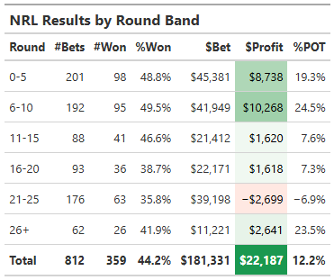 Review historical betting performance across NRL current bets, AFL line bets and AFL head-to-head betting results.