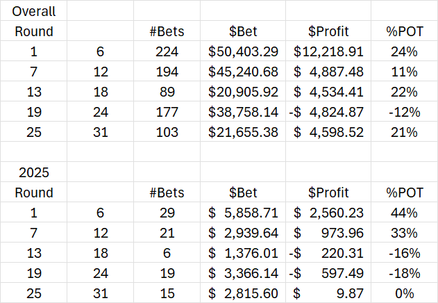 As previously shown, NRL seems to do very well in the first half of the year, and 2025 was no exception. Overall in 2025 we made 16.7% POT from 90 bets. The majority of it – once again – came from the first 12 rounds, and in particular the first 6 rounds.